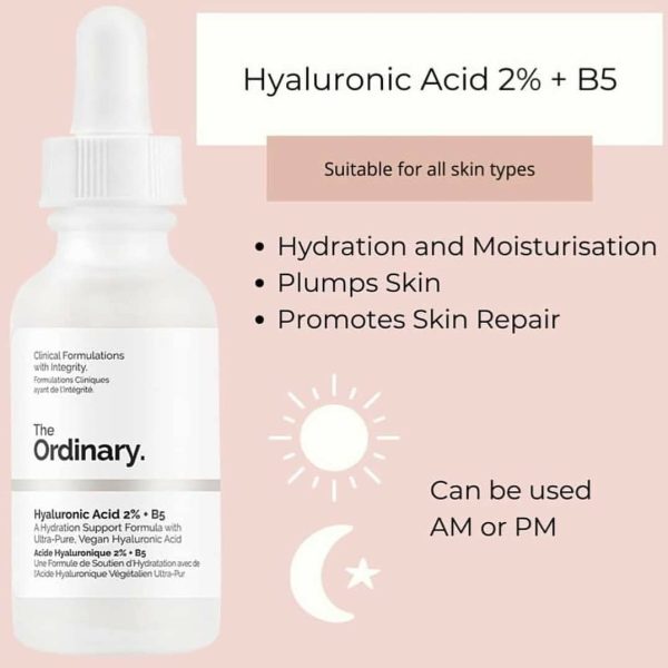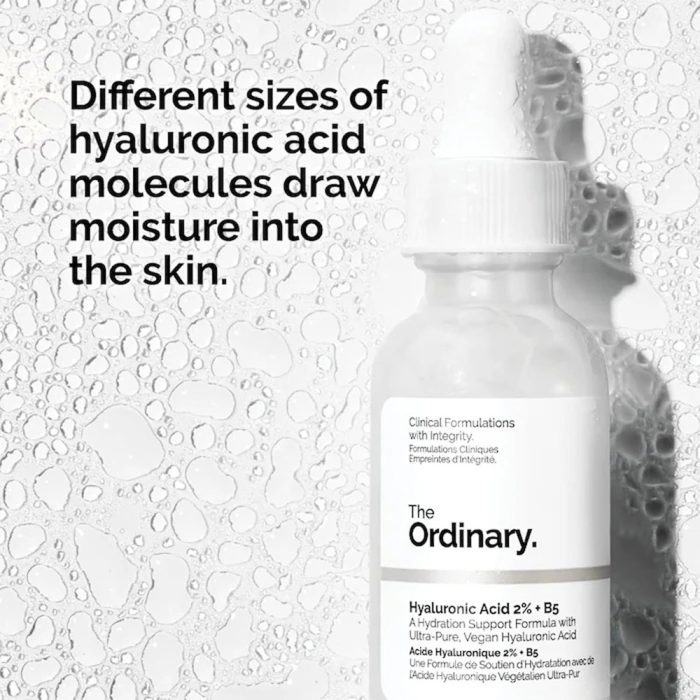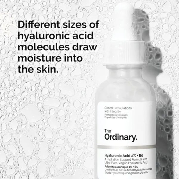 سرم صورت حاضر دارای خاصیت رطوبت رسانی قوی و کمک به حفظ رطوبت درون پوست است. The Ordinary از ترکیب سه نوع هیالورونیک اسید در اندازههای مولکولی مختلف در تولید این محصول خود استفاده کرده تا بتواند در اعماق پوست نیز نفوذ داشته باشد. بهعلاوه ترکیب آن با ویتامین B5 باعث شده تا هیدراسیون و آبرسانی پوست در تمام سطوح پایدار و با عملکرد بالایی انجام بشود.